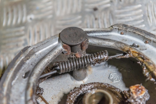 Zuerst geht’s an die Demontage der Räder. Beide Räder haben je eine verschraubte Achse, welche mit einer Schraube auf der linken Seite (= Kopf der Achse) geklemmt wird. Die Klemmschraube hat ein normales Rechtsgewinde, die Achse selber ein Linksgewinde! Zum Glück hat Fred das im Kopf der Achse eingeschlagene „L“ (–> left) entdeckt. Merci.