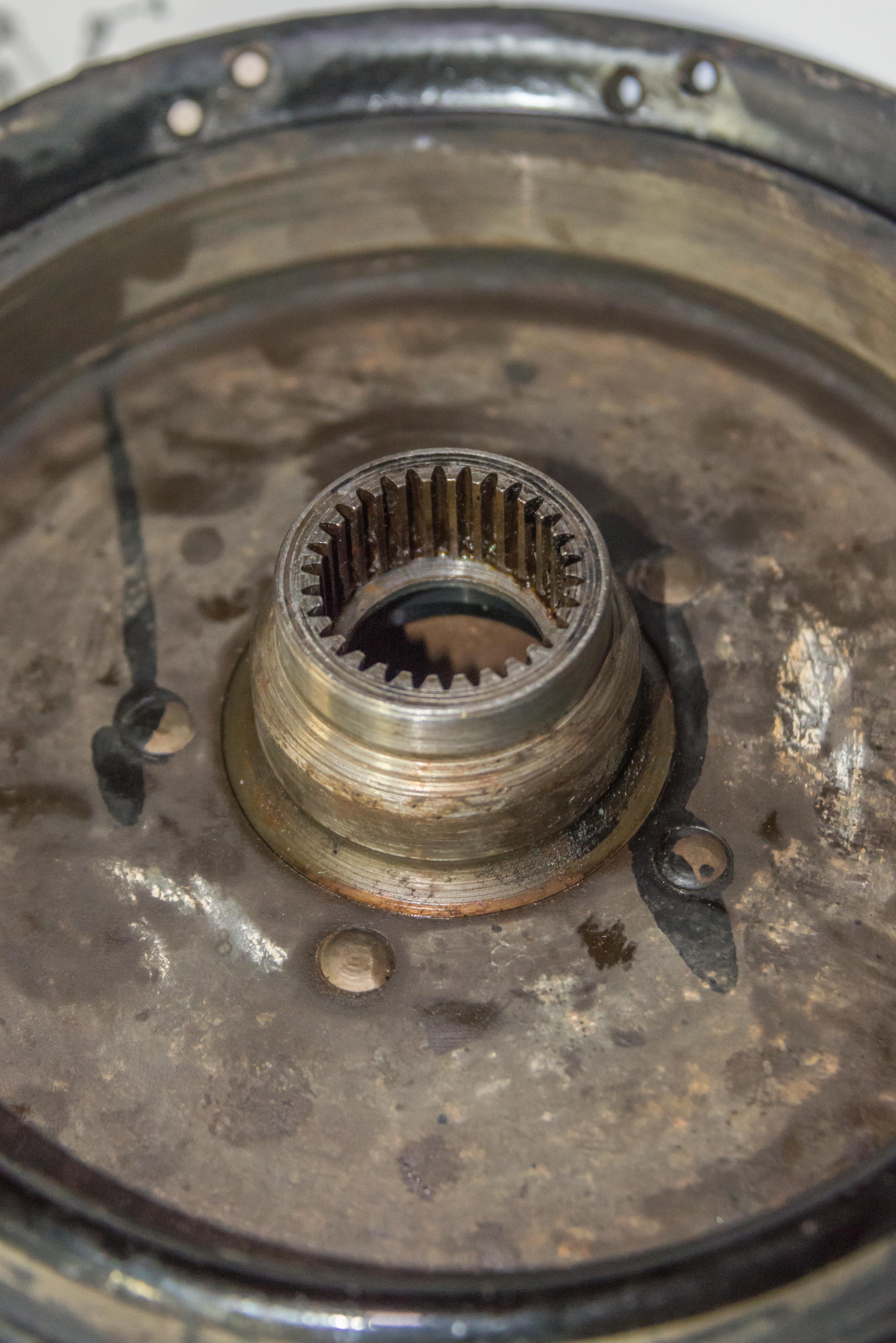 Für das Zerlegen der Radnaben braucht es etwas Fingerspitzengefühl. Die Feder, welche die Mutter an Ort und Stelle hält, ist noch schnell entfernt. Die Mutter selber braucht schon die Untersützung von Fred und dem Kupferdorn. Sie ist übrigens mit einem Linksgewinde ausgestattet. Das „Innenleben“ kommt nach der Behandlung mit dem Heissluftföhn und einem passenden Rundstahl auch raus. Es bleibt die Lagerschale des inneren Lagers drinnen. Die muss warten bis zum nächsten Schrauberabend. Bis dahin reinige ich die Teile gründlich.
