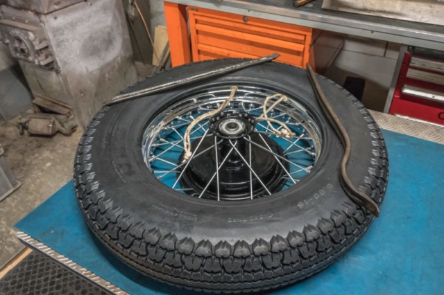Aber wenn man nicht es noch nie an einem fetten Motorradreifen gemacht hat, dann ist das nicht so einfach. Und ein „Chrampf“. Zum Glück hat Röschu Erbarmen mit dem Lehrling.