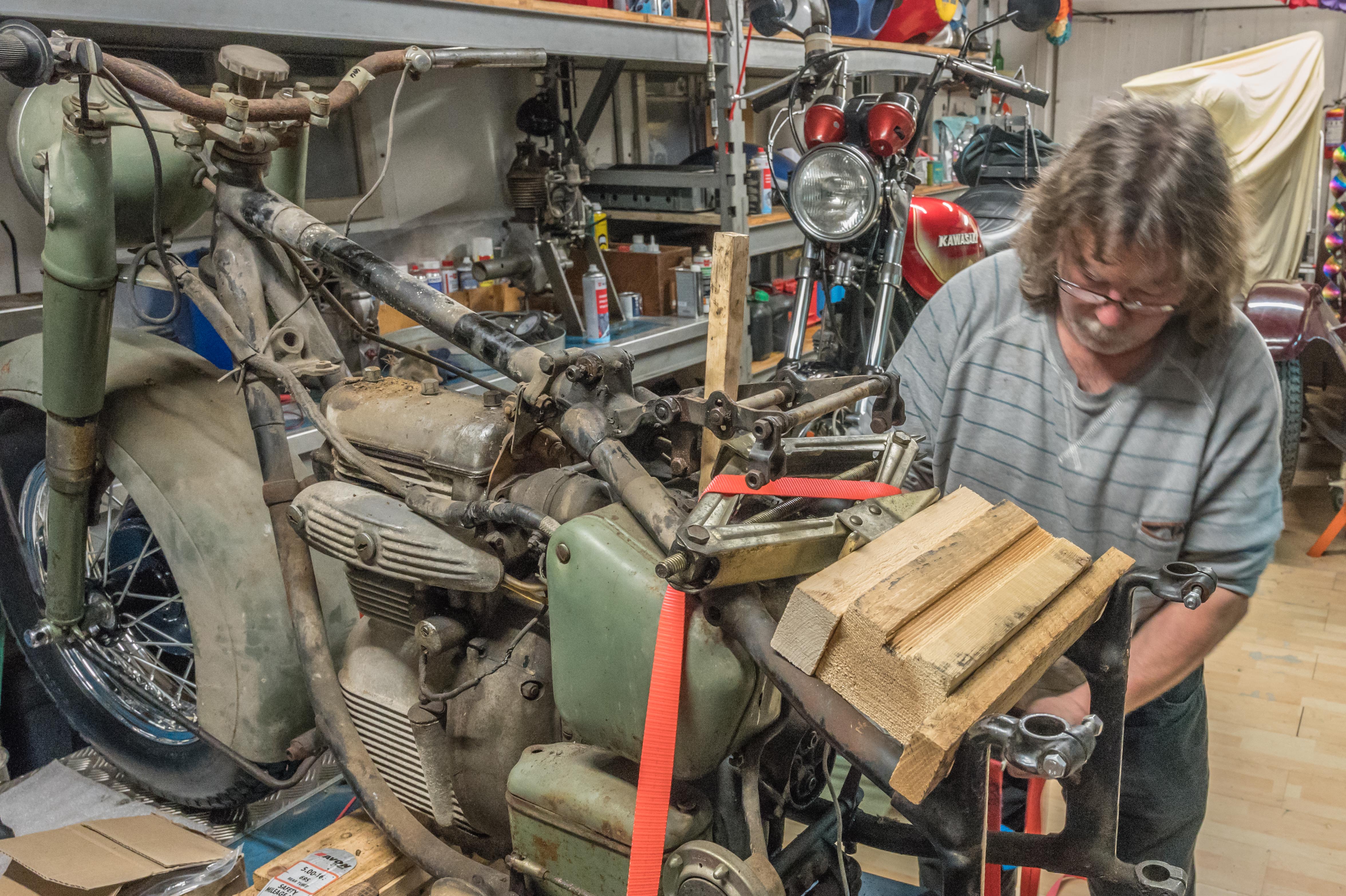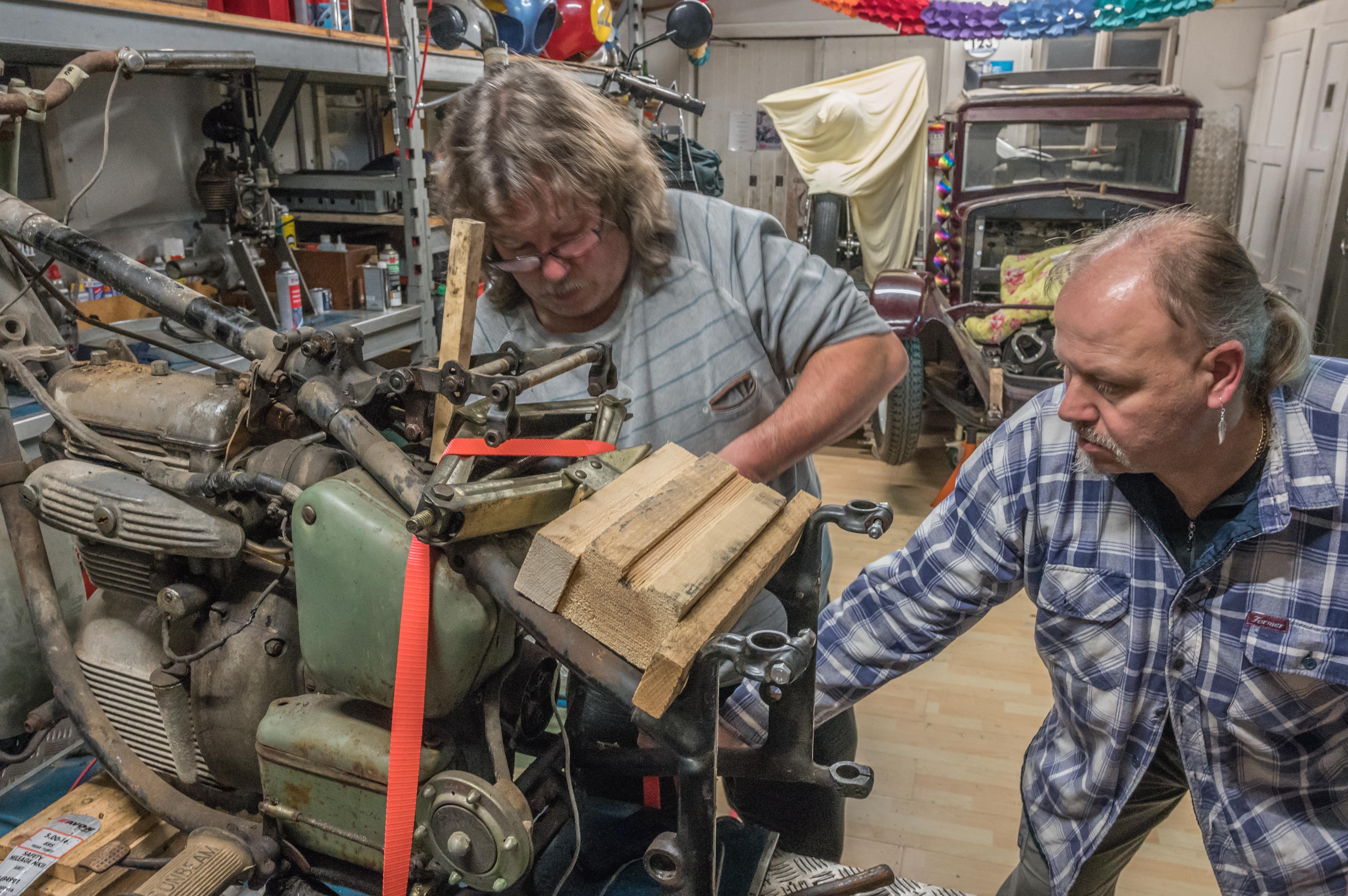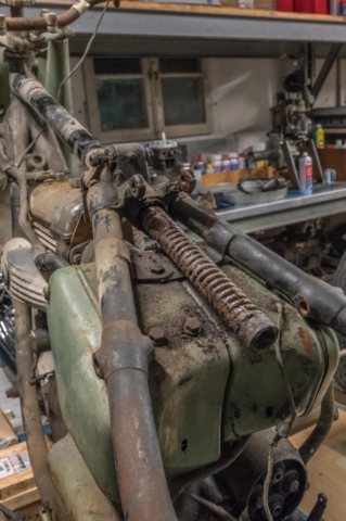 Jetzt kommt der Sattel weg! Das Leder ist schon vermodert und der Filz darunter nur noch Staub und Dreck, löst sich fast von alleine auf. Die vordere Befestigungsachse löst sich gut. Die hinteren Befestigungen können auch gelöst werden. Nun bleibt noch die Schwinge mit der Federung übrig. Die ist viel zäher! Wegen dem Federdruck gibt Röschu mit einem Wagenheber Gegendruck. So kann das Ganze kontrolliert „entspannt“ werden. Das Spannset hält alles an Ort und Stelle. Studi hilft auch tatkräftig mit: diese zentrale Achse hat sich böse festgefressen, oder so. Am Ende ist sie verbogen, ausgeleiert, verrostet und … Sie ist „fertig“. Hansueli will eine neue Achse herstellen. Zu guter Letzt kommt die im Rahmen dezent versteckte Feder doch noch zum Vorschein. Eine echt elegante Konstruktion. „Cantilever“ Baujahr 1952!