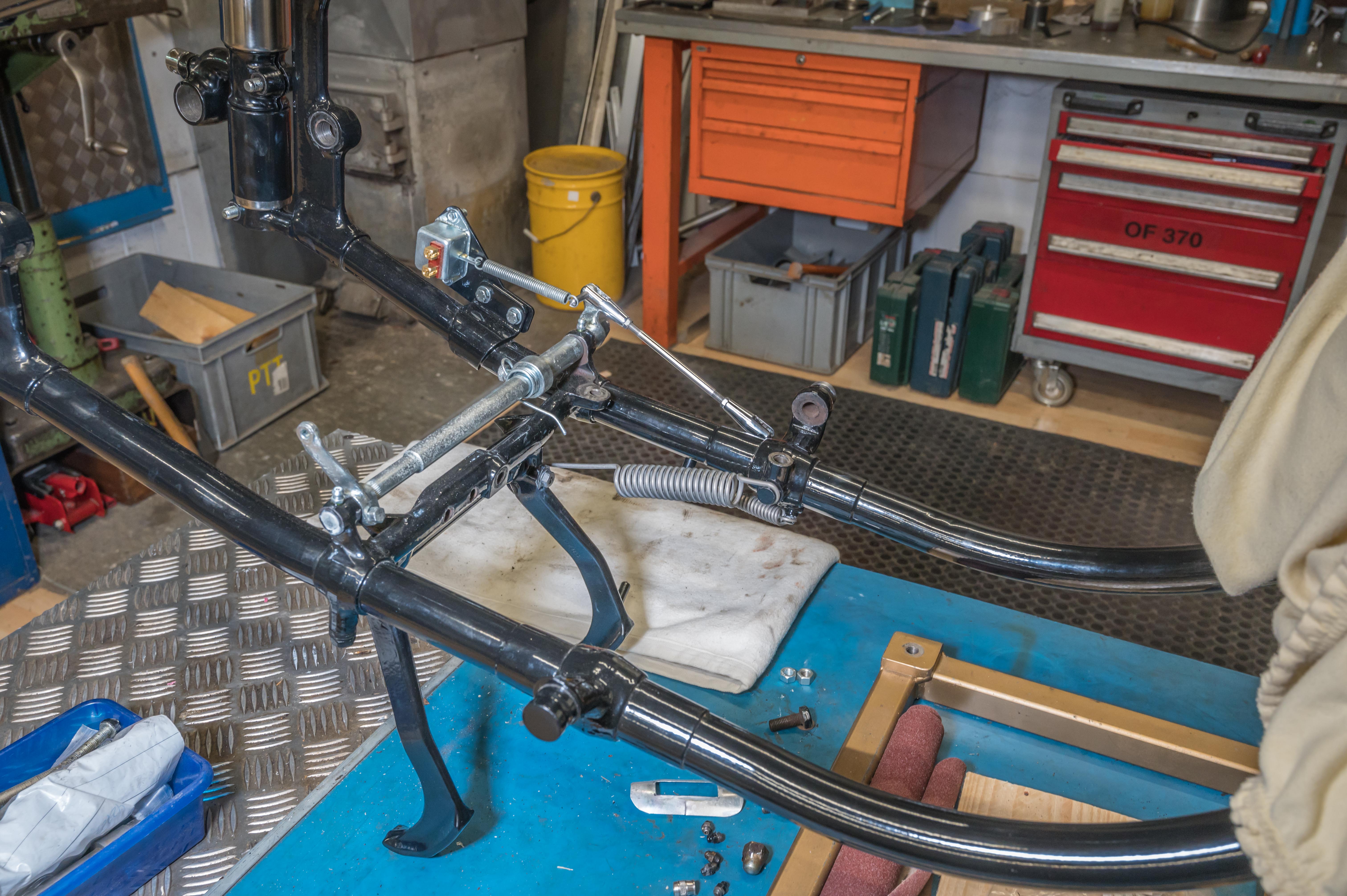zudem montieren wir zusammen den Hauptständer und den Seitenständer. Das Bike „steht“ wieder auf den eigenen Beinen! Merci Fred!