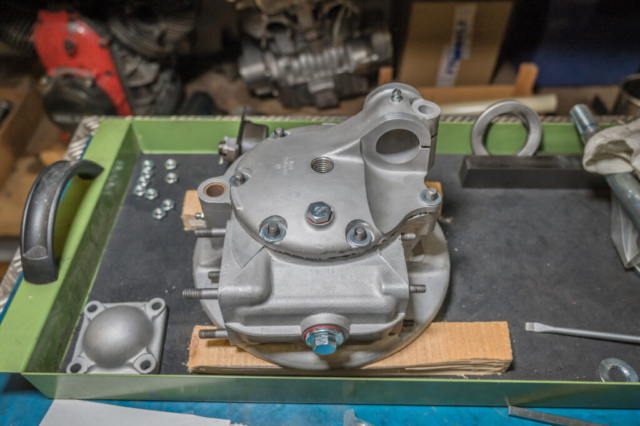 Jetzt ist das Schneckengetriebe bereit. Rücklaufkanal offen, Distanzscheibe und Schneckenrad auf dem Support im Gehäuse montiert. Der Ölspritzschutz ist auch eingelegt. Fehlt nur noch der Deckel. Röschu gibt die „Easy Gasket“-Dichtmasse auf den Deckel. Nur hauchdünn auftragen! Dann montieren. Muttern drauf, anziehen, und Bewegung des Schneckenrades kontrollieren. Wow, passt perfekt! Nun fehlt nur noch die Schneckenwelle. Dann kommt dann auch das Öl in das Gehäuse. Merci Röschu!