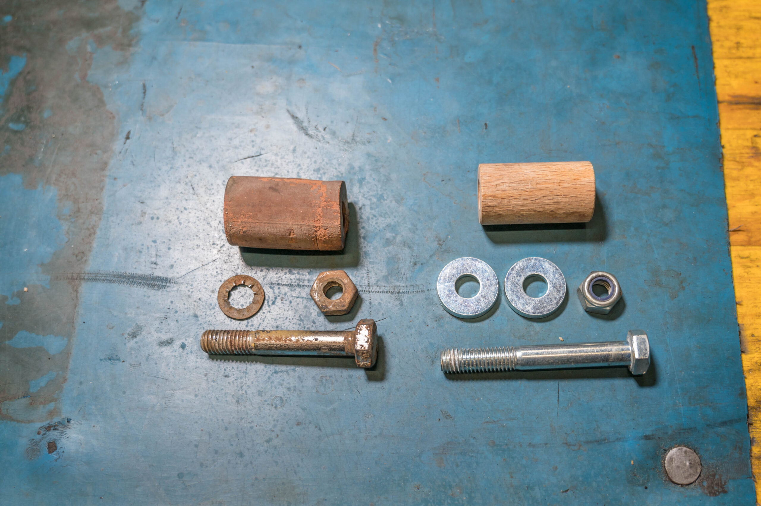 Am Sozius fehlt noch der Anschlag im Gelenk. Dazu verwende ich einen Teil eines Besenstieles und drehe das Ding auf dem Drehbank plan. Dann noch ein Loch durchgebohrt und fertig ist der Ersatz. Ich verwende eine neue Schraube, beidseitig eine Unterlagscheibe, sowie eine neue, moderne Stoppmutter mit Sicherungsring. Jetzt ist der Soziussitz komplett und wartet auf die Montage.