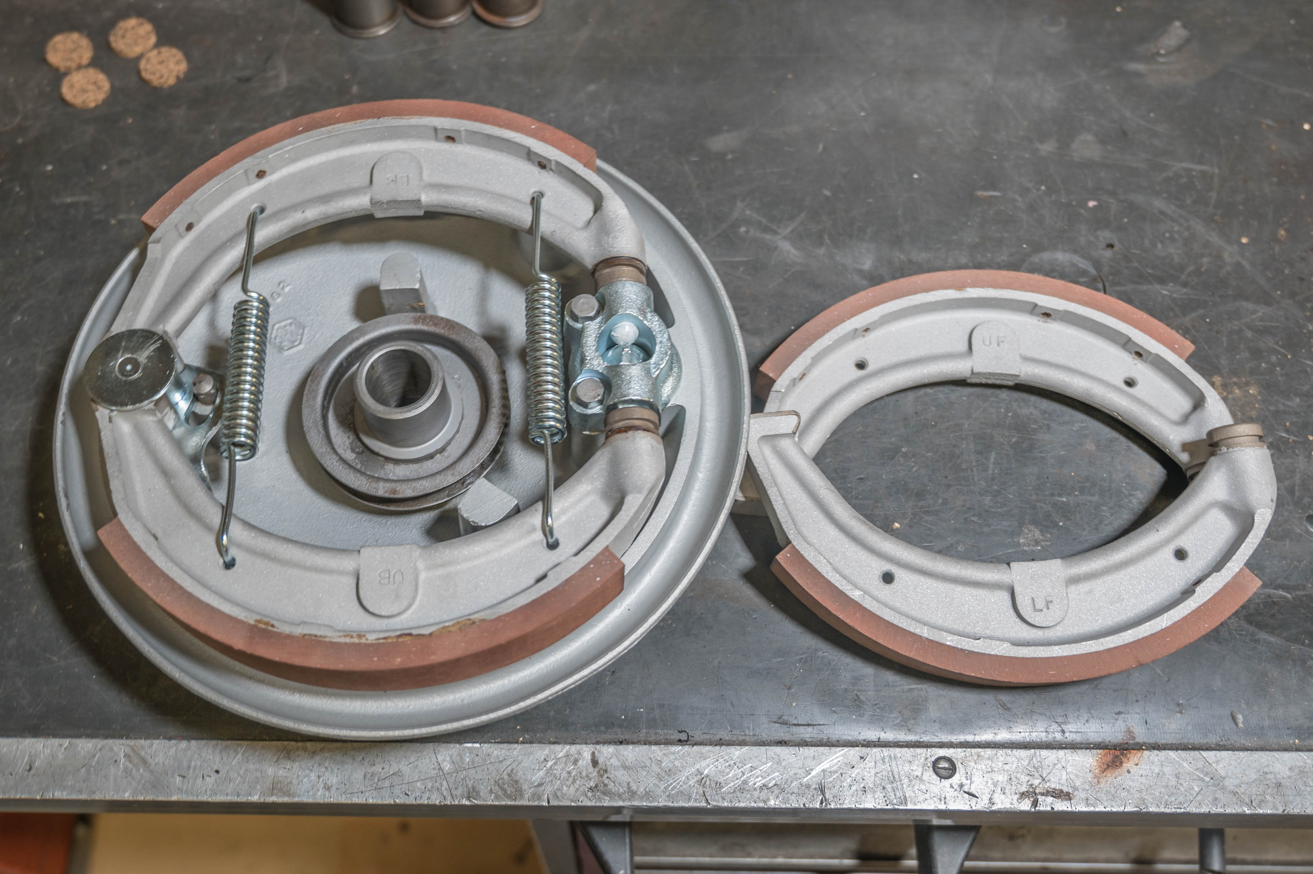 Um die Bremsbeläge abzudrehen verwendet Röschu das Bremsschild des Vorderrades. Die beiden Räder sind zum Glück identisch. Also die Bremsbacken der Hinterradbremse mit den Federn montieren.