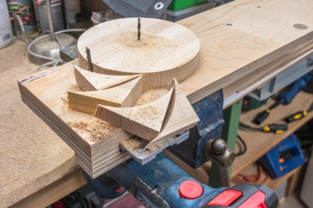 Aus ein paar Holzresten schneide ich mit der Stichsäge und einer speziellen Vorrichtung rasch einige Scheiben. Die sind nicht super präzise, aber für das Arbeitsstativ allemal genügend. Etwas Holzleim zwischen die Scheiben, ein paar Zwingen und eine Gewindestange in der Mitte sorgen für den nötigen „Druck“. Sobald der Leim ausgehärtet ist kommt die Montage der Stützen. Passt!