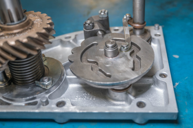 Auf der Seitenplatte montiere ich bereits wieder aufbereitete Komponenten. In den ersten beiden Fotos ist dabei die aufgebesserte Kickstarter-Welle zu sehen. Die neue Hülse verbrigt sich bereits hinter der Rückholfeder, die alte Hülse ist vorne dran. Der Spannring ist montiert und nun hat die Well kaum mehr Spiel. Das wird sich sicher auszahlen. Daneben ist die Ganganzeige gereinigt und der Schaltautomat provisorisch montiert. nach der Montage der Kickstarterwelle können die Sicherungsbleche hochgebogen werden.