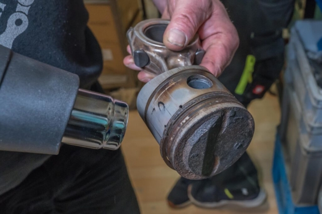 Röschu meint: ein Versuch ist es wert. Dazu muss das Zeug allerdings gereinigt werden. Also Demontage der Pleuel. Der Heissluftföhn hilft dabei. Röschu macht die nötigen Schläge auf die Bolzen gleich selber.
