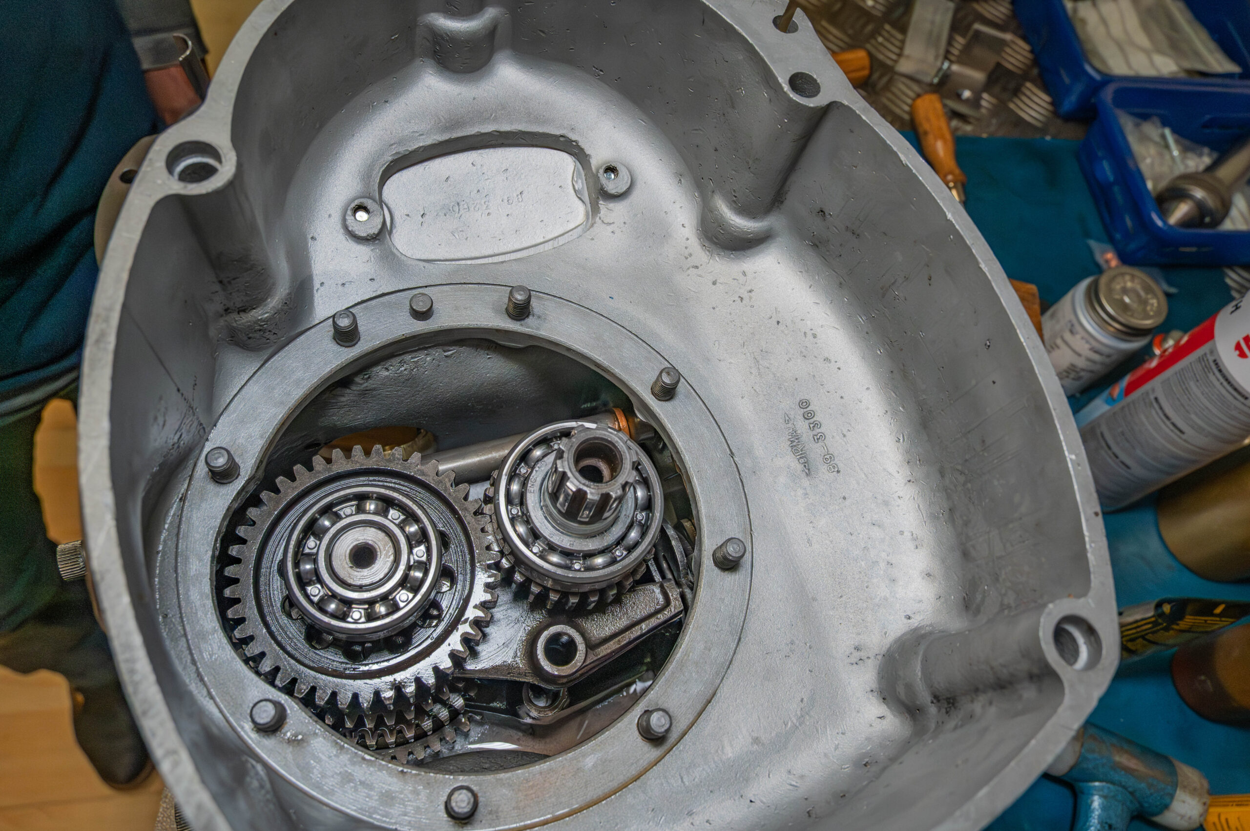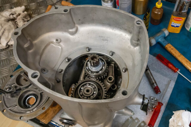 Die vordere Getriebeplatte muss auch noch neu abgedichtet werden. Da gab es zwar wenig Öl, das rauskam, aber zuviel um als „gut“ zu gelten. Paltte raus, Papierdichtung weg. Mit Bremsreiniger putzen. Easy Gasket auftragen. Antrocknen lassen. Platte mit den Achsen wieder reinfummeln und Muttern setzen.